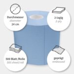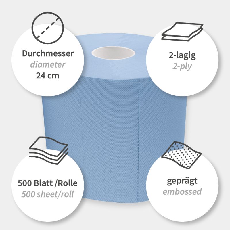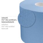 Благодаря перфорации листы легко отрываются. Рулон имеет тиснёную поверхность для лучшей впитываемости. Синий цвет обеспечивает хорошую видимость на фоне продуктов и светлых поверхностей.