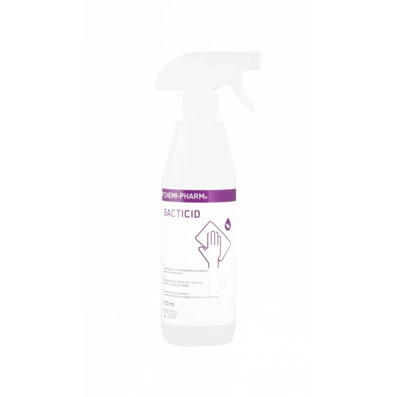 BACTICID — готовое к применению средство на основе этанола для быстрой дезинфекции поверхностей, устойчивых к спирту. В составе используется чистый, малолетучий этиловый спирт, что снижает риск раздражения дыхательных путей. BACTICID обладает широким фунгицидным и бактерицидным действием, инактивирует как оболочечные, так и безоболочечные вирусы.